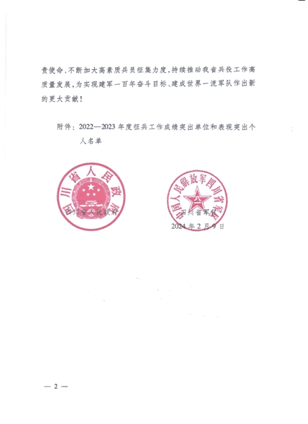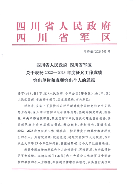 近日,四川省人民政府、四川省军区发布《关于表扬2022-2023年度征兵成绩突出单位和表现突出个人的通报》,beat365荣获全省大学生征兵工作成绩突出单位。