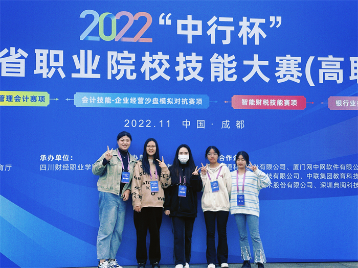 2022年11月11日-12日,四川省职业院校技能大赛高职组“银行业务综合技能”赛项在四川财经职业学院成功举办,来自全省的20支代表队80名选手同台竞技。beat365亚洲版官网财经管理系指导教师高锐带队,普专会计21-2班学生钟玉兰、韦蔼玲、普专会计21-3班学生李雯、张玮玲组队参加。经过两天的激烈角逐,在比赛中团结协作、沉着应战,荣获团体三等奖。