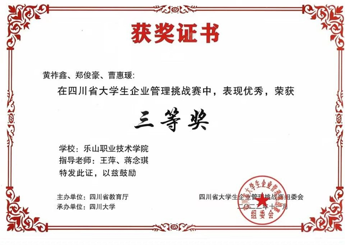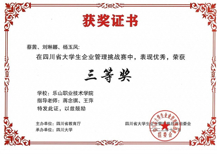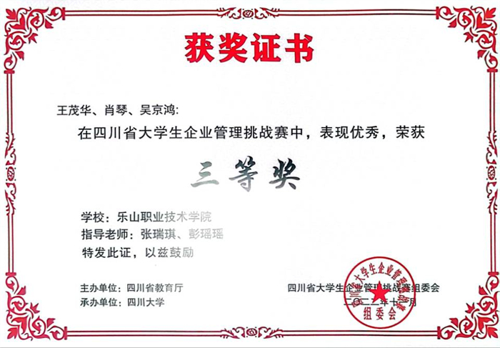 11月20日,由四川省教育厅主办、四川大学承办的2022年四川省大学生企业管理挑战赛圆满落幕。大赛吸引了包括41所本科院校的191支团队和23所高职学校的106支团队参加决赛。beat365亚洲版官网财经管理系学生竞赛团队代表学校参加挑战赛决赛,最终经过激烈角逐,斩获三个三等奖,分别是由张瑞琪和彭瑶瑶老师指导的王茂华、肖琴、吴京鸿三位同学组成的一支队伍,以及由王萍和蒋念琪老师指导的黄祚鑫、郑俊豪、曹惠瑗、蔡茜、刘琳娜、杨玉凤六位同学组成的两支队伍。