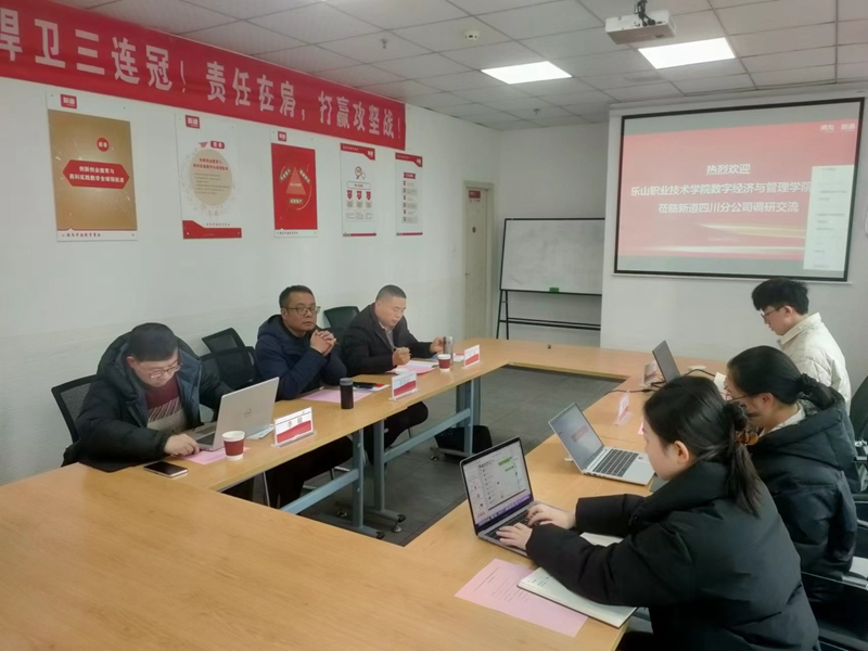 新道科技股份有限公司西南大区副总经理瞿刚、四川分公司副总经理成华敏、校企合作经理李鳕镘参加了调研。调研会上成华敏首先围绕数智产业发展背景下高职院校如何优化课程设置和实训室建设进行了精彩的分享和汇报。双方就大数据背景下如何深入开展实训室建设、教材建设、课程建设、1+X证书考试等方面合作的达成了广泛共识。