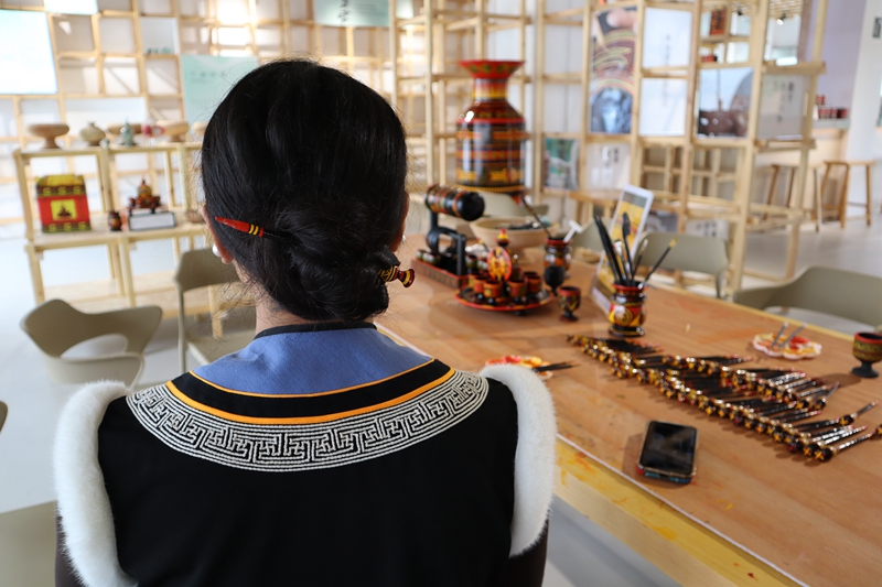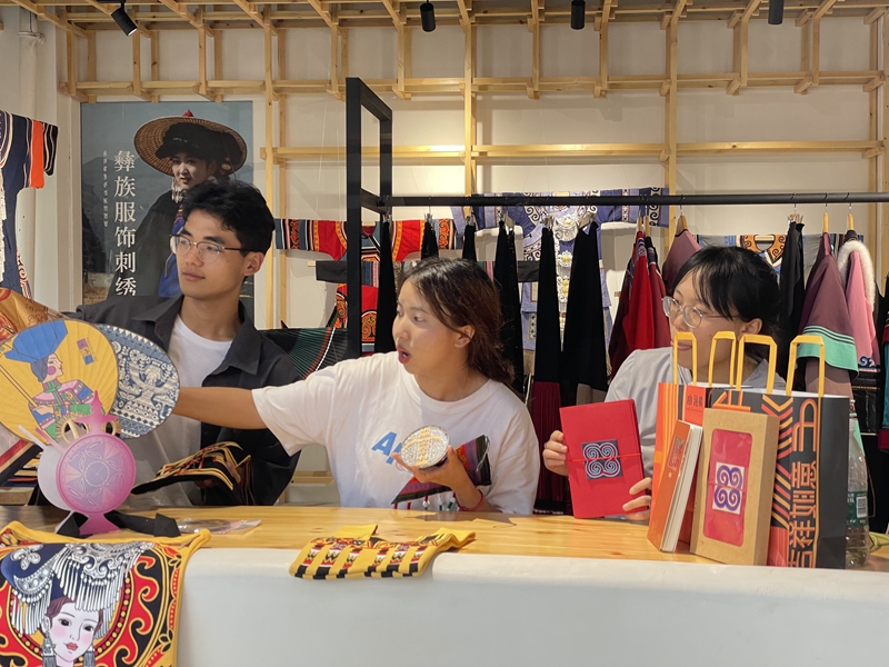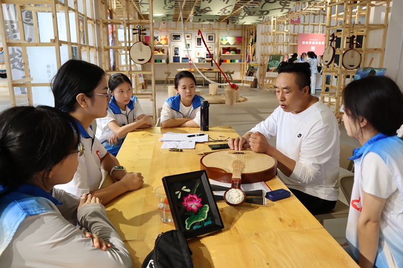 团队在曹呈楠、林子琪两位老师的带领下,在山海情非遗文化体验馆探寻彝族刺绣、漆扇、银饰与漆器等非遗项目。在非遗技艺展示区,非遗传承人加瓦杨加为同学们介绍和演奏了彝族特有的口弦和月琴。同学们在馆内进行非遗手作体验,漂漆扇、制漆器,感受彝族非遗文化的独特魅力。