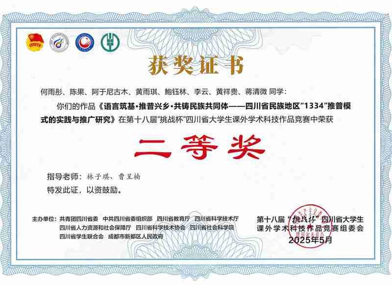 由共青团四川省委、中共四川省委组织部、四川省教育厅、四川省科学技术厅、四川省人力资源和社会保障厅、四川省科学技术协会、四川省社会科学院、四川省学生联合会、成都市新都区人民政府主办的第十八届“挑战杯”四川省大学生课外学术科技作品竞赛于2025年5月底在成都医学院举办。数字经济与管理学院项目《语言筑基·推普兴乡·共铸民族共同体——四川省民族地区“1334”推普模式的实践与推广研究》在本次竞赛中荣获二等奖。