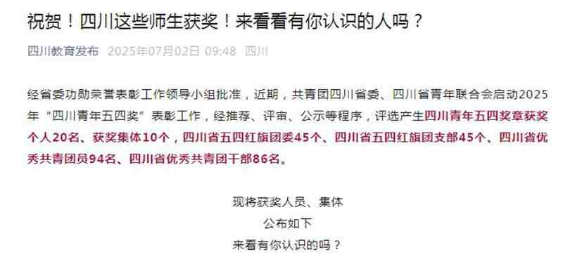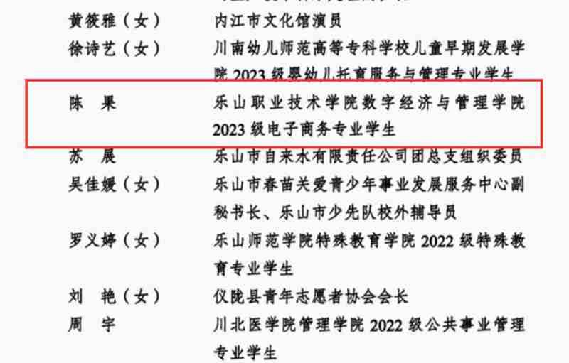 经省委功勋荣誉表彰工作领导小组批准,近期,共青团四川省委、四川省青年联合会启动2025年“四川青年五四奖”表彰工作,经推荐、评审、公示等程序,评选产生四川青年五四奖章获奖个人20名、获奖集体10个,四川省五四红旗团委45个、四川省五四红旗团支部45个、四川省优秀共青团员94名、四川省优秀共青团干部86名。beat365亚洲版官网数字经济与管理学院电子商务专业2023级学生陈果获评“四川省优秀共青团员”称号。