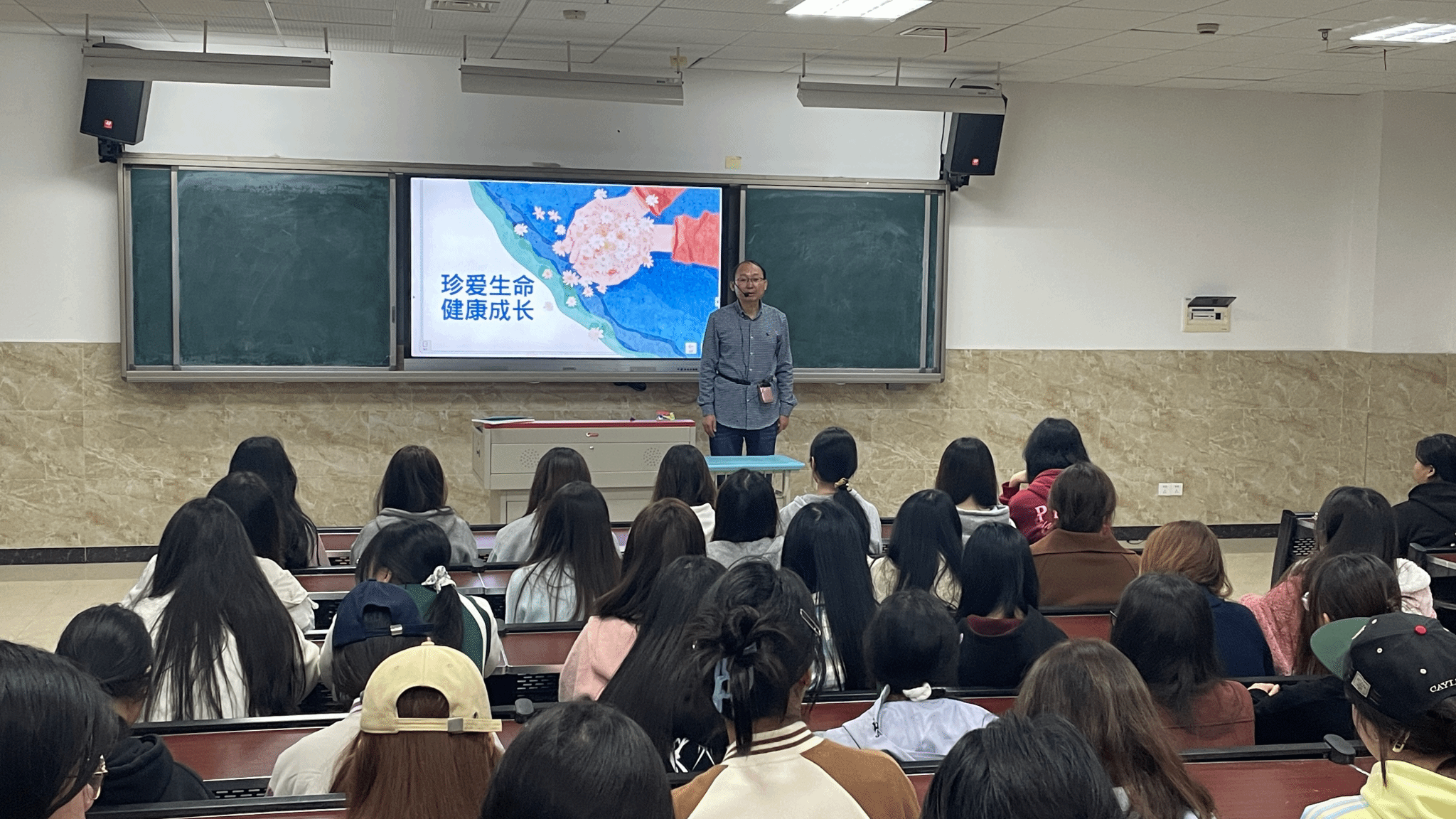 辅导员让全体同学“屏住呼吸30秒”,感受生命存在,生命的可贵;讲述一个人的出生、成长历程,让同学们体验生命的由来与不易;分享乐山女孩雷庆瑶的故事,鼓励同学们始终积极面对人生,理解生命的维度,让自己的生命丰富且有价值。