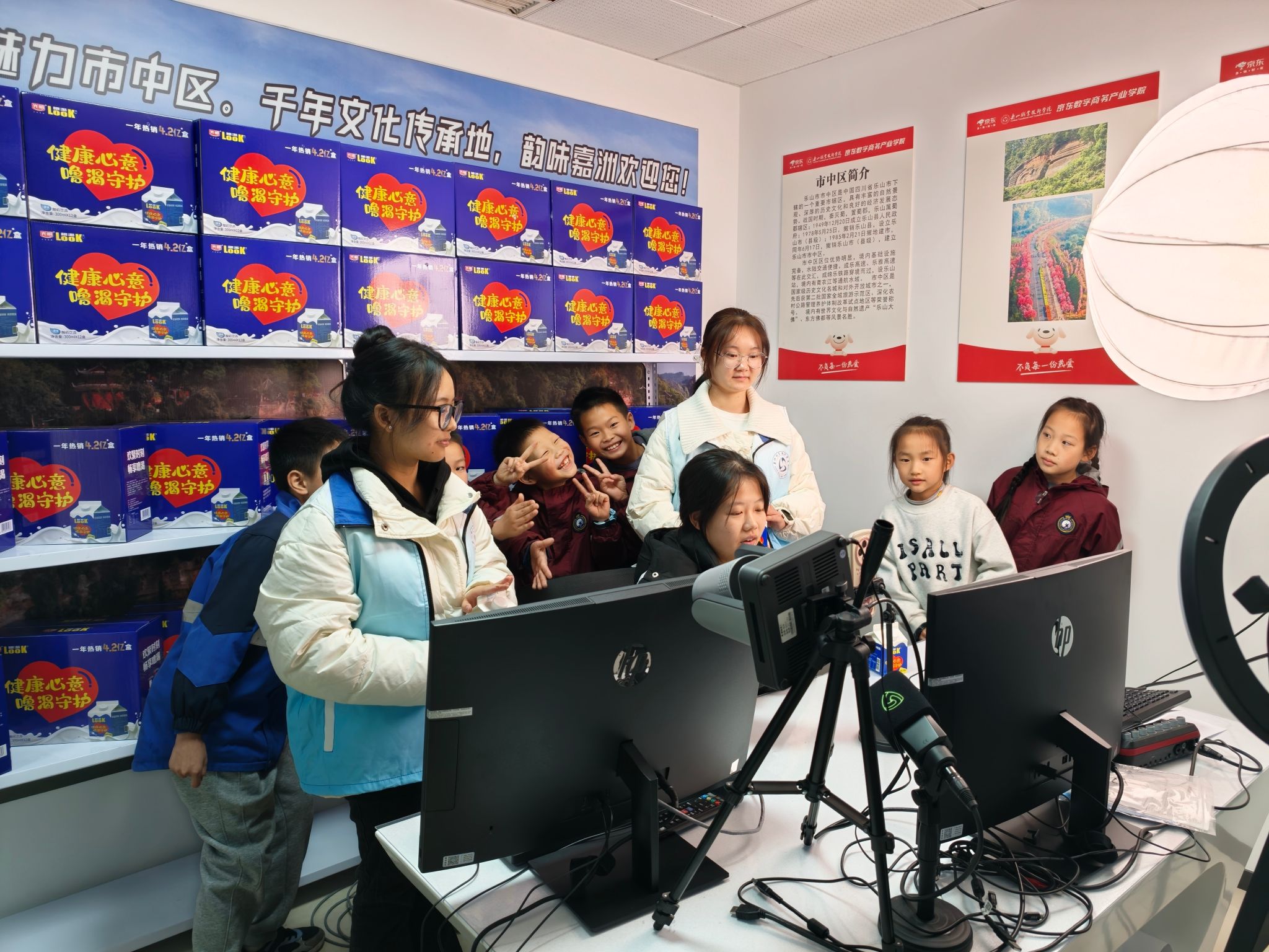 “我们不是在教孩子卖东西,而是让他们在体验中学习沟通、协作与表达。”在产业学院教师易秋甸、黎雨青、周雪的引导下,直播选品、脚本设计等专业知识被转化为孩子们能懂、爱玩的趣味任务。乐山甜皮鸭、钵钵鸡调料等本土特产成为“直播货品”,孩子们在大学生志愿者“一对一”陪伴下,从选品到模拟直播全程参与,学得不亦乐乎。