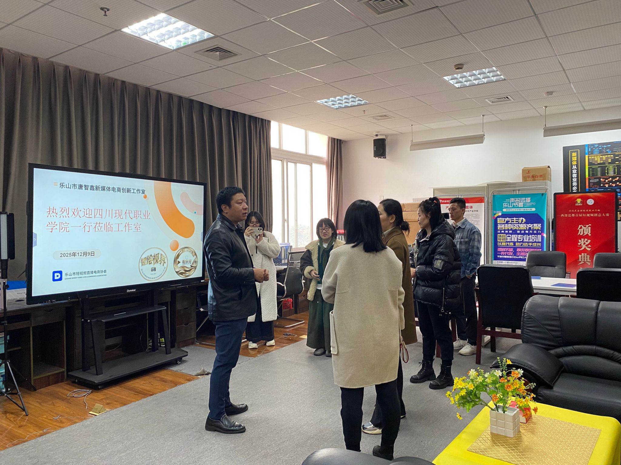 为深化新媒体电商领域产教融合实践,共享专业建设与人才培养优质经验,2025 年 12 月 9 日下午,四川现代职业学院数字经济学院数字媒体技术专业群负责人王贇带队,电子商务专业负责人于晶、骨干教师李怀瑾、黄丹青等一行 4 人,专程赴beat365亚洲版官网数字经济与管理学院乐山市唐智鑫新媒体电商工作室开展交流学习。