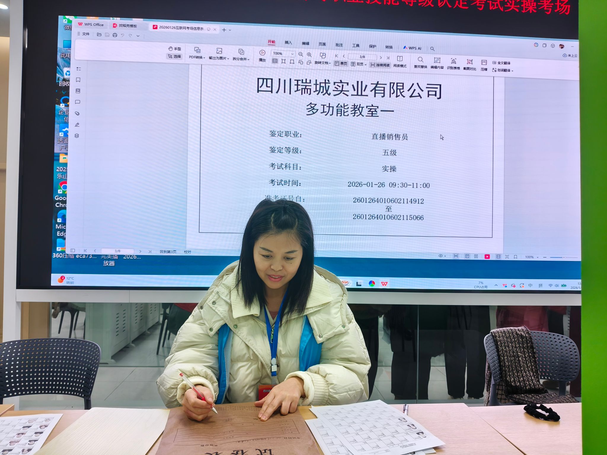 2026年1月26日,数字经济与管理学院电子商务专业武会玲教师,受乐山市人力资源和社会保障局、商务局联合邀请,前往市中区开展互联网营销师(初级+高级)职业技能等级实操考评工作。