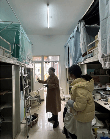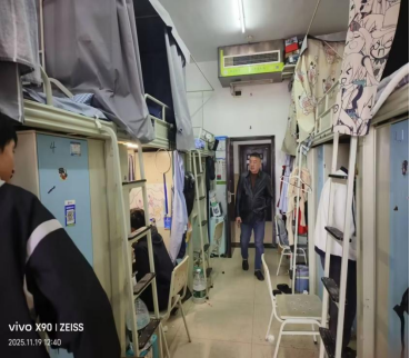 在环境卫生方面,辅导员们逐寝查看床铺整理、地面清洁、垃圾清运及物品摆放情况,对存在杂物堆积、卫生死角的寝室现场指出问题,提出整改建议,引导同学们养成良好生活习惯,共同维护舒适的住宿空间。