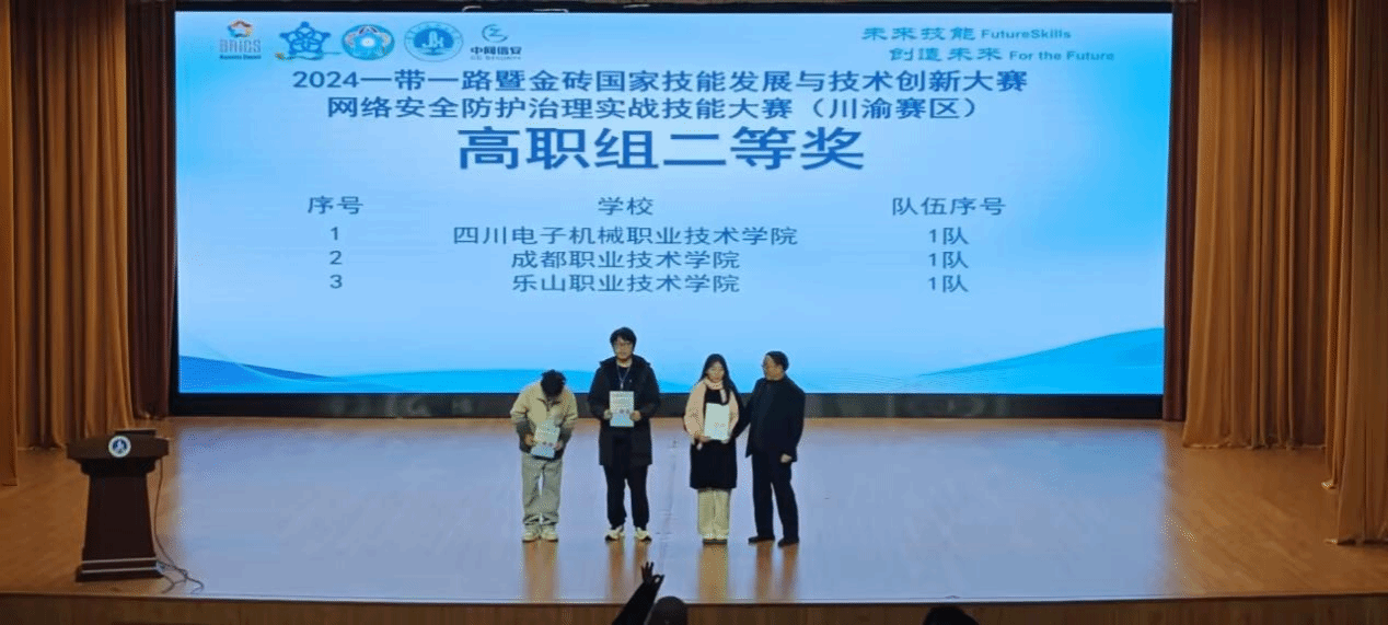 近日,在川渝赛区2024一带一路暨金砖国家技能大赛网络安全防护治理赛项选拔赛中,beat365学子陈奇宇、叶科、朱佳明组成的团队凭借扎实的网络安全知识、精湛的技术以及出色的团队协作,在指导老师于寒冰的带领下,荣获二等奖。