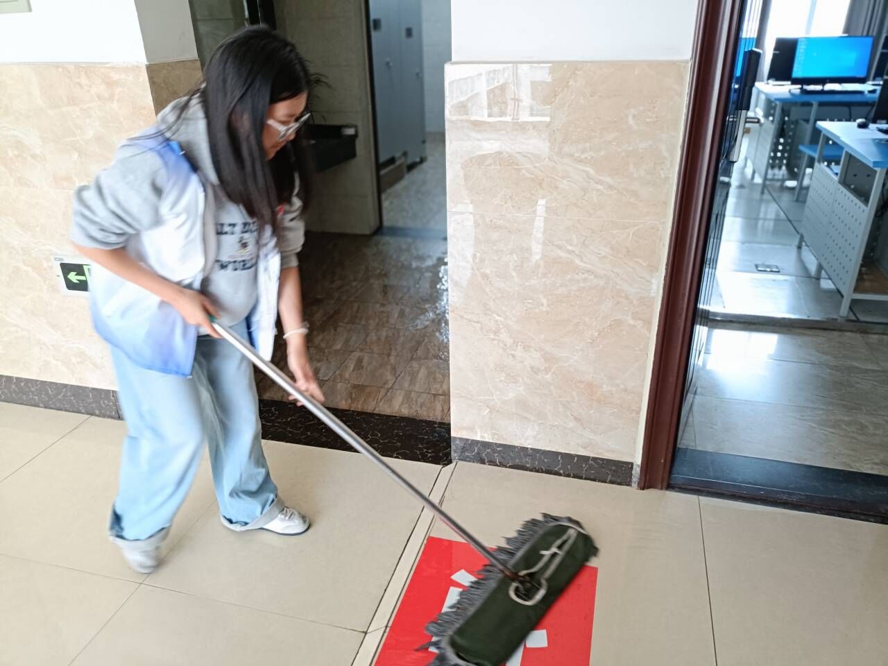 活动开始前,同学们集合后,先是进行了人员分组和区域分工,而后到达教学楼,各自按照分工有序进行活动,活动中,志愿者们分工协作,认真细致,不怕脏乱,尽职尽责,同时,在此次活动中各志愿者明白了维护教学楼卫生的意义。