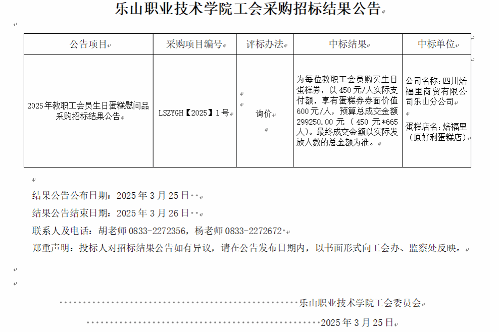 2025年教职工会员生日蛋糕慰问品采购招标结果公告