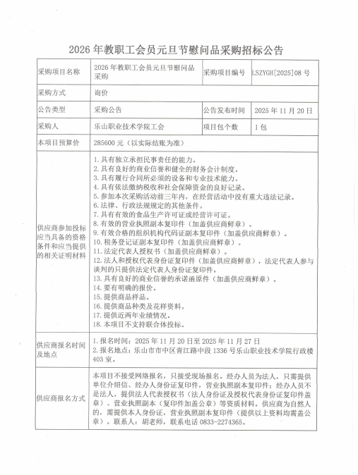 2026年教职工会员元旦节慰问品采购招标结果公告