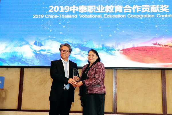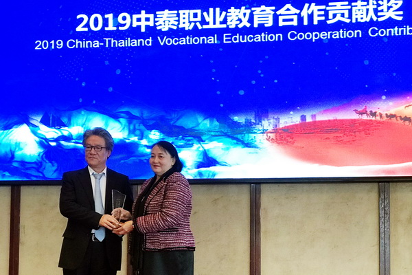 大会期间,泰国教育部职业教育委员会、泰国一带一路基金会,向在中泰合作办学中作出突出贡献的个人与单位颁奖。beat365亚洲版官网荣获“2019中泰职业教育合作贡献奖”,泰国教育部职教委副秘书长巴塔玛女士为学院颁奖。