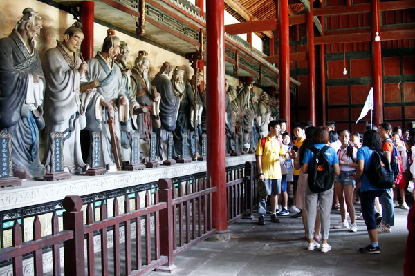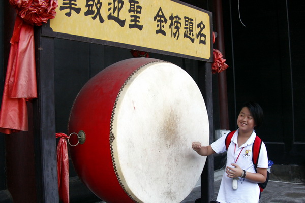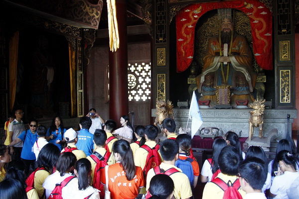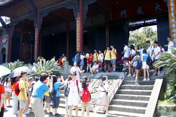 下午14:00,营员们来到了今天活动的第二站——犍为文庙。尽管烈日炎炎,但一走进文庙,孩子们立刻被周边古朴宁静的氛围所吸引。随后,大家分成小组,在工作人员的引领与讲解下,进一步了解文庙的历史文化以及祭拜礼仪。在一面“金榜题名”的大鼓前,孩子们还体验了用手击鼓,鼓声阵阵,余音回旋不绝。在大成殿内,营员们瞻仰孔子塑像,虔诚地祭拜先贤。