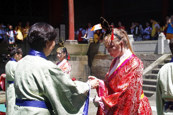 作为“2019中国寻根之旅四川乐山营”课程安排的重要组成部分,此次成人礼仪式遵循古制,盥洗、上香、酹酒等一一进行。“行冠笄礼,吟诵祝词。”在主礼官的支持下,在清脆悠扬的乐声中,乌兰为女儿希吉尔奉上发簪,为希吉尔加冠及笄。