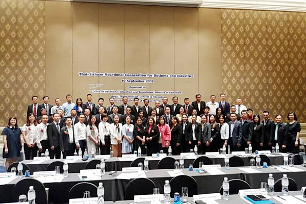 随后,代表团参加了“2019四川--泰国职业教育交流会”。泰国教育部、中国驻泰国大使馆、泰国驻成都总领事馆、泰国职业院校代表以及泰国和中资企业代表共计80余人出席会议。大会以“产教融合、工学结合”主题,SCG等泰国企业以及中资企业代表在大会上分别作了企业对于人才需求的报告,泰国职业院校就人才培养,特别是留学生招生培养、联合办学等问题与四川高职院校进行了广泛交流。我院财经管理系主任鲍学东在会上做了学院总体情况、专业设置、与泰国合作情况、国际学生招收与培养做了介绍,并重点推荐了光伏、智能制造、电子信息专业,希望拓展与泰国职业院校、企业等的教育交流合作。