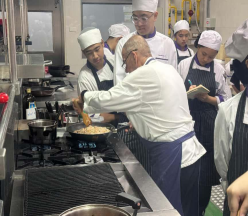 7月22日上午,又是跟着潘老师学习的一天,这次的课程是水果蛋糕制作。准备材料时,看着新鲜的草莓、芒果、蓝莓等水果,就已经让人充满期待。先制作蛋糕胚,将鸡蛋、面粉、牛奶、黄油等材料按照一定比例混合搅拌,经过打发、搅拌等一系列步骤后,倒入模具放入烤箱烘烤。等待蛋糕胚出炉的过程中,我们开始制作奶油,将淡奶油打发至浓稠状,加入适量细砂糖调味。蛋糕胚烤好后,待其冷却,把奶油均匀地涂抹在蛋糕表面和夹层,再将切好的水果精心地摆放上去进行装饰。一个个漂亮又美味的水果蛋糕就完成了,香甜的蛋糕搭配新鲜的水果,口感丰富,甜而不腻。下午跟随意大利老师学习意大利烩饭,老师先介绍了意大利烩饭常用的米以及独特的烹饪方法。制作时,先用黄油将洋葱丁炒香,加入意大利米翻炒,让米粒均匀地裹上黄油,接着慢慢倒入热鸡汤,一边倒一边搅拌,确保每一粒米都能吸收到汤汁。在这个过程中,需要不断观察米粒的状态和汤汁的浓稠度,适时调整火候。当米粒煮至口感恰到好处时,加入提前炒好的蔬菜、肉类或海鲜,再撒上芝士碎,搅拌均匀,让芝士融化在烩饭中,增加浓郁的奶香味道。最后装盘,再撒上一些香草碎作为点缀,一道正宗的意大利烩饭就呈现在眼前,品尝着自己做的烩饭,感受着意大利美食的独特魅力。