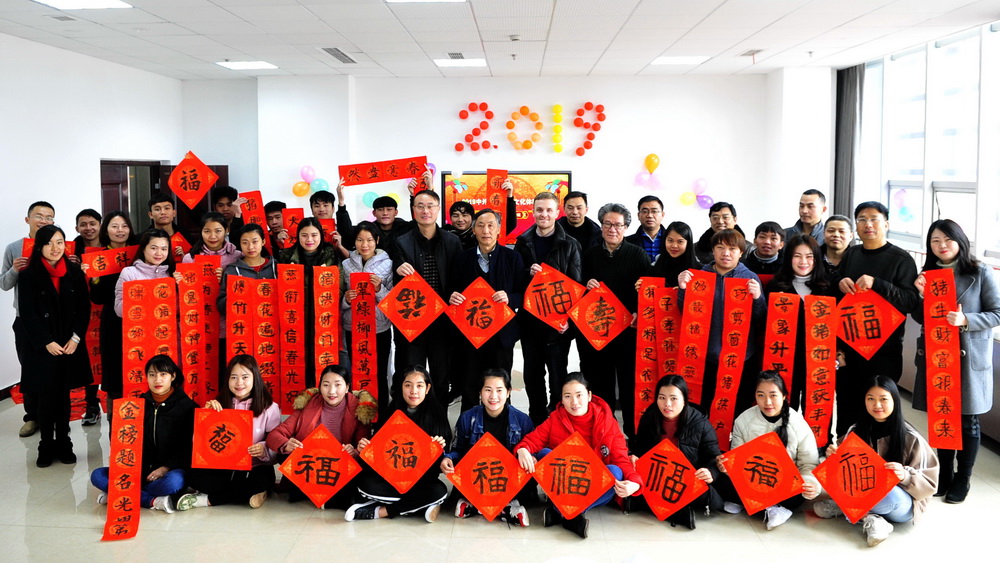 2019年1月25日上午,学院国际合作处在学术交流中心举办“情暖冬日,感悟中华文化”迎新春活动,让留校的27名国际学生及1名外籍教师,零距离体验了春节期间的中国民俗文化。学院领导蹇路、刘忠、陈芝海,学院留学生管理办公室、国际合作处、学生工作部、教务处、书画协会等相关人员参加了此次活动。 学院党委书记蹇路代表学院祝外籍师生春节快乐!他说,春节是中国的传统佳节,家家户户辞旧迎新,团聚在一起吃年饭。今天安排大家一起写福字,写春联、包饺子、吃团年饭,希望大家和我们一道,过一个快乐、开心的中国年。 同时,他希望留校同学要注意安全,合理安排好自己的寒假学习生活,过一个平安、幸福、快乐的春节。