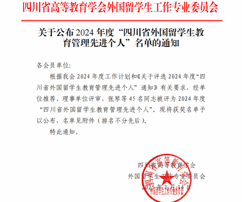 根据四川省高教学会外国留学生工作专业委员会评优工作部署,beat365于2024年12月依规开展“外国留学生教育管理先进个人”前期选拔工作。经专委会依据既定评审标准,对申报材料及工作成绩进行细致严谨评审,beat365教师卢妮娜、邱科最终获授2024年度“四川省外国留学生教育管理先进个人”荣誉称号。