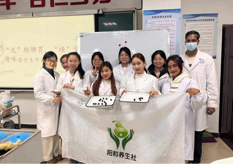 生物医药学院阳和养生社于2025年11月20日下午在实训楼开展亲手制作“东方巧克力”,探寻脾胃健康的养生智慧主题活动。此次活动由阳和养生社团指导老师周莉江、来自老挝、孟加拉国、柬埔寨的留学生及阳和养生社社员共同参与,留学生们在传统中药养生体验工坊感受中医药养生文化的魅力。