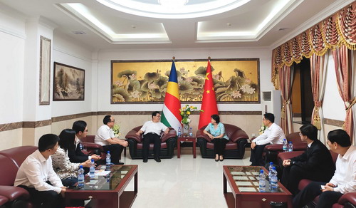 On June 11, 2024, Ambassador Lin Nan met with delegations from Shandong Jining Vocational College, Weifang Vocational College of Engineering, Sichuan Leshan Vocational and Technical College, and Zhejiang Vocational College of Mechatronics, as well as the chairman of the Africa side of the China-Africa Vocational Education Alliance. They discussed further promoting vocational education cooperation and cultural exchanges between China and Seychelles.