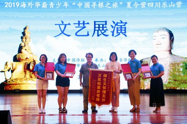 At 7:30 p.m. on August 8, the performance showcase of the 2019 "China Roots - Seeking Journey" Summer Camp for overseas Chinese - descendant teenagers in Leshan, Sichuan, was held in the auditorium of Leshan Vocational and Technical College. Attending the event were Yan Jianguang, Secretary - General of the Legal Advisory Committee of the Sichuan Provincial Federation of Returned Overseas Chinese, Ou Wentong, Chairman of the Leshan Municipal Federation of Returned Overseas Chinese, Chen Zhihai, Deputy Party Secretary and Secretary of the Discipline Inspection Commission of the college, Huang Xiaoli, Director of the Party (College) Office, Ye Hongguang, Director of the Student Affairs Department, all team leaders, volunteers, and participants.