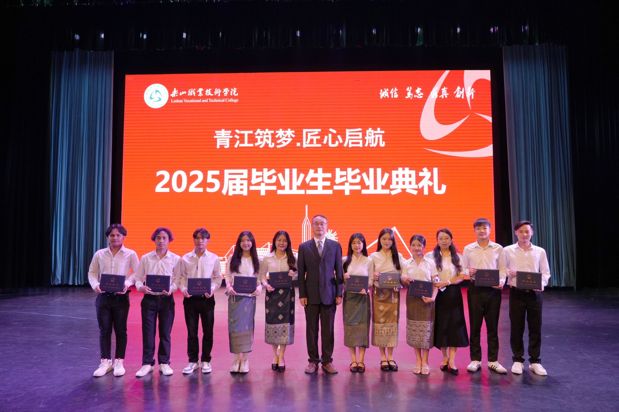Cheng Dingbin, Secretary of the Party Committee, presented honorary certificates to representatives of the provincial outstanding graduates. Liu Zhong, President of the school, awarded graduation certificates to graduate representatives and international student graduate representatives, and took group photos with them.