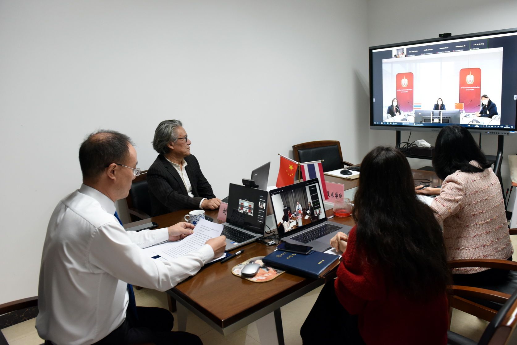 On the afternoon of October 11th, Leshan Vocational and Technical College held a Zoom video conference with the Thai Red Cross Nursing College (hereinafter referred to as "STIN") and signed a Memorandum of Understanding (MOU) on site. Attending and participating in the signing ceremony were Kanogwan Suwanpatikorn, Principal of STIN; Vilailert Komton, Vice Principal; relevant persons in charge of international cooperation; Liu Zhong, Principal of Leshan Vocational and Technical College; Chen Zhihai, Deputy Secretary of the Party Committee and Chairman of the Trade Union; heads of the Academic Affairs Office; and relevant personnel from the International College.