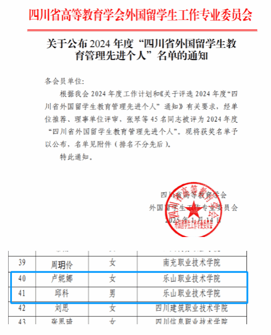 In accordance with the deployment of the excellence evaluation work by the Foreign Students Work Professional Committee of the Sichuan Higher Education Society, our school initiated the preliminary selection work for the “Outstanding Individuals in the Education and Management of International Students” in December 2024, following the prescribed procedures. After a meticulous and rigorous review of the application materials and work achievements by the committee based on the established evaluation criteria, our school’s teachers Lu Nini and Qiu Ke were ultimately conferred the honorary title of “Outstanding Individuals in the Education and Management of International Students in Sichuan Province” for 2024.