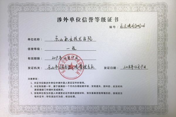 The Exit - Entry Administration of the Leshan Municipal Public Security Bureau comprehensively evaluated and scored the foreign national management mechanisms, management records, daily management and services, and illegal and disciplinary violations of foreign nationals in dozens of foreign - related units across the city. Based on the results, four levels of foreign national management credibility units were selected. Our college was awarded the first - class certificate of credibility among the first batch of foreign - related units in the city.