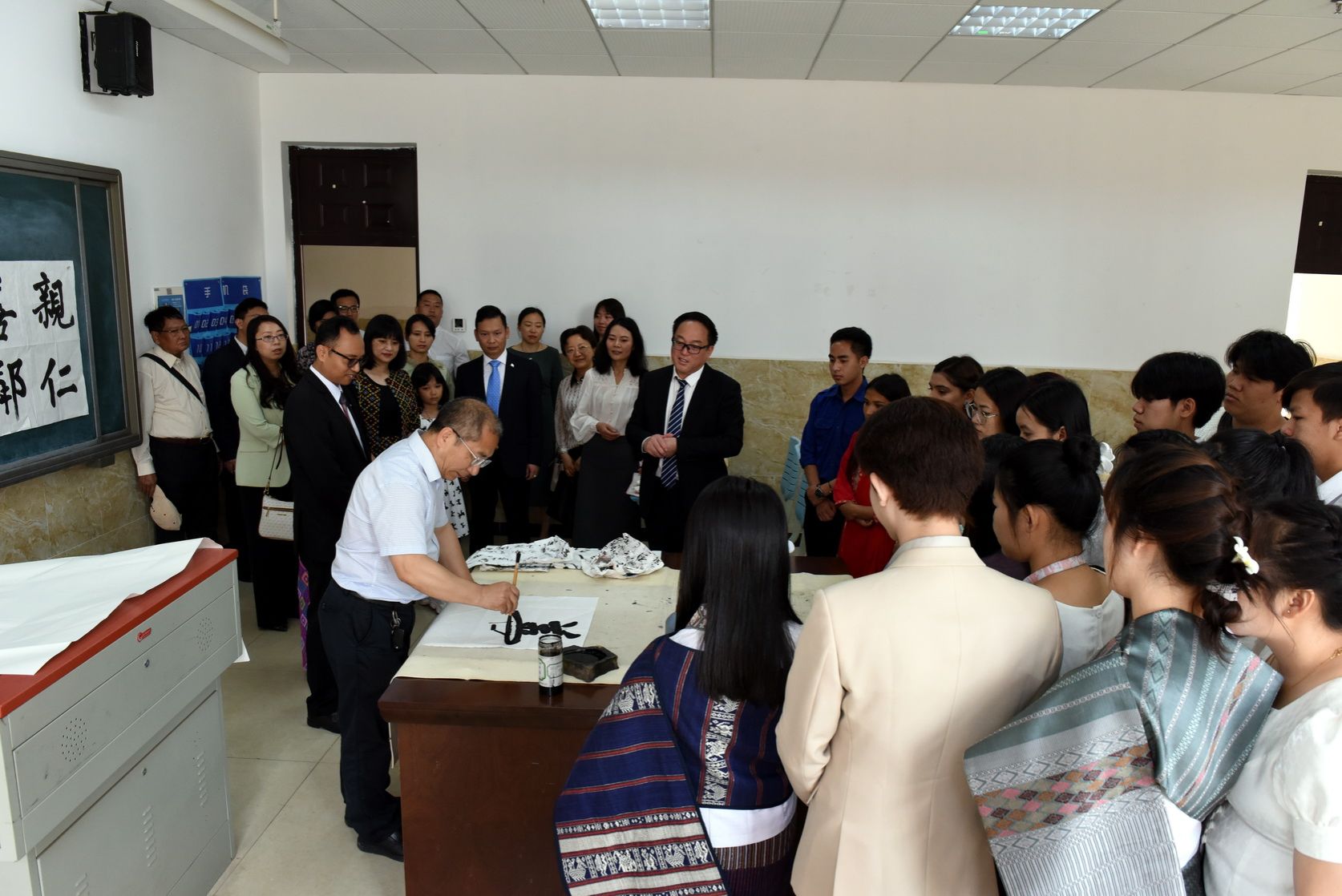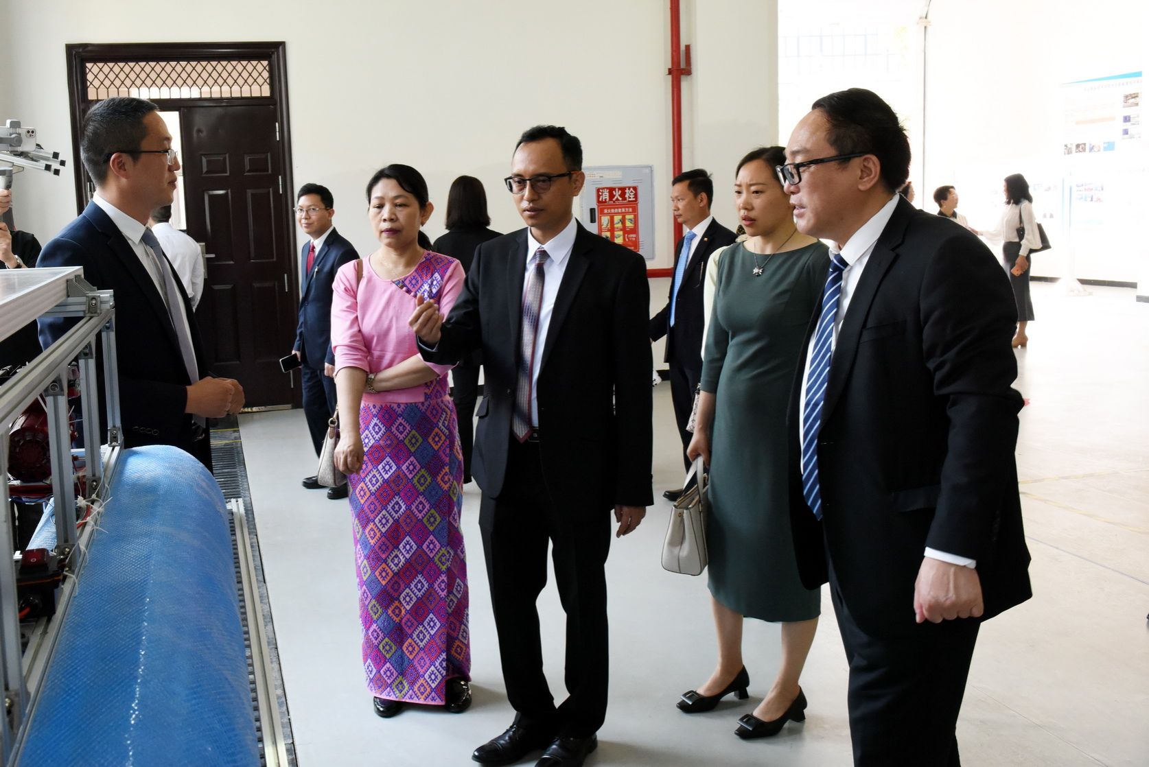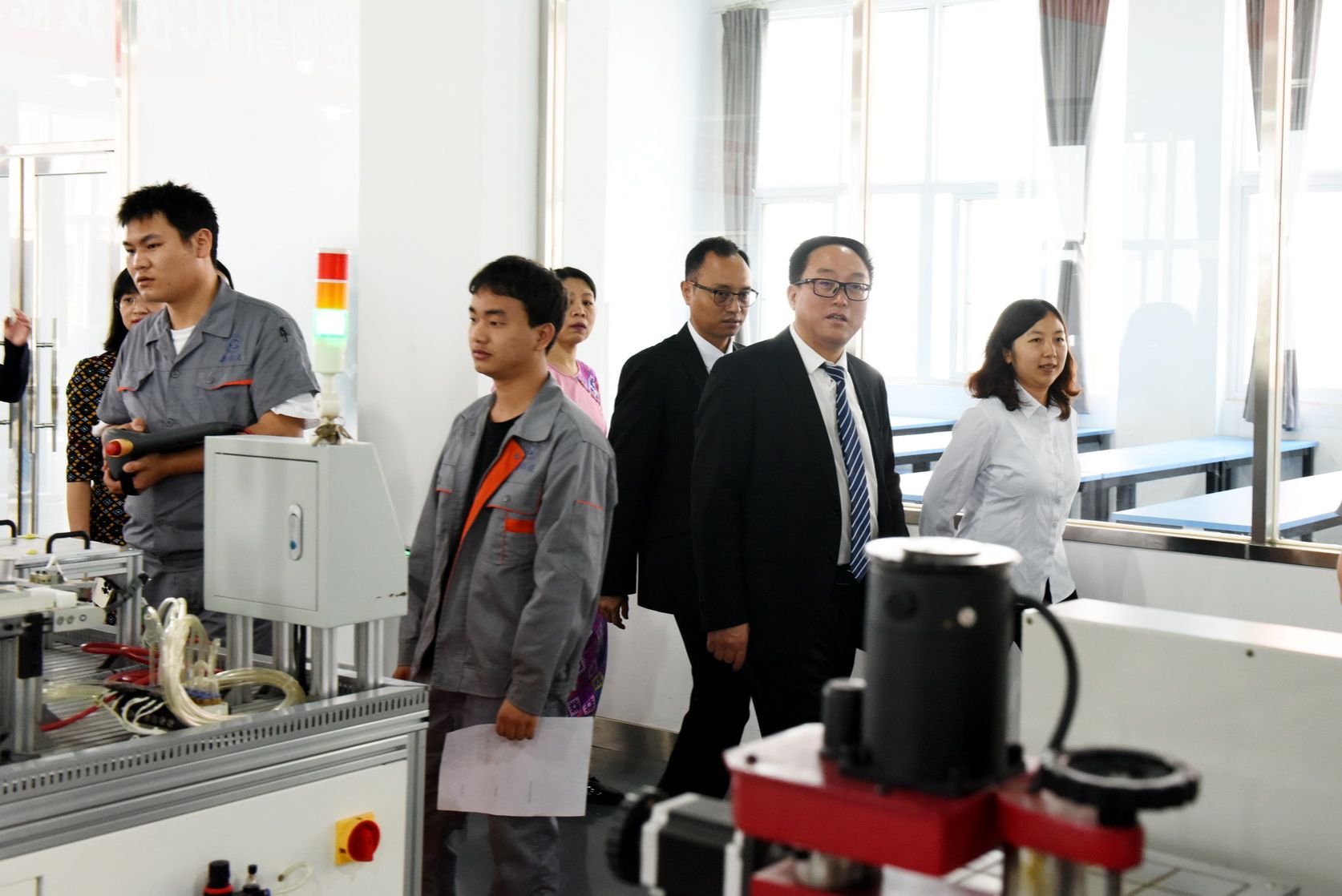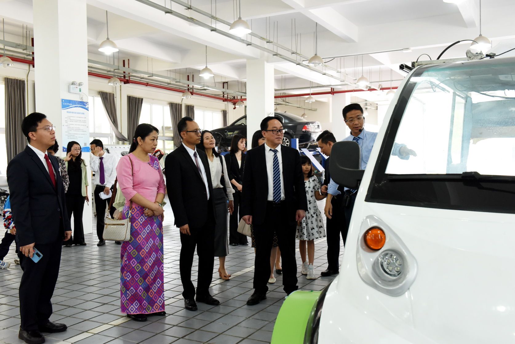 Lu Zhencai and his delegation first visited the international student classroom to observe a demonstration of Chinese culture classes for international students. They then watched the college’s promotional video in the auditorium, observed students’ martial arts training at the Qingjiang Martial Arts Base, and viewed practical training sessions at the Automotive Testing and Maintenance Training Base, the Industrial Robotics Technology Training Base, and the Polysilicon Training Base.