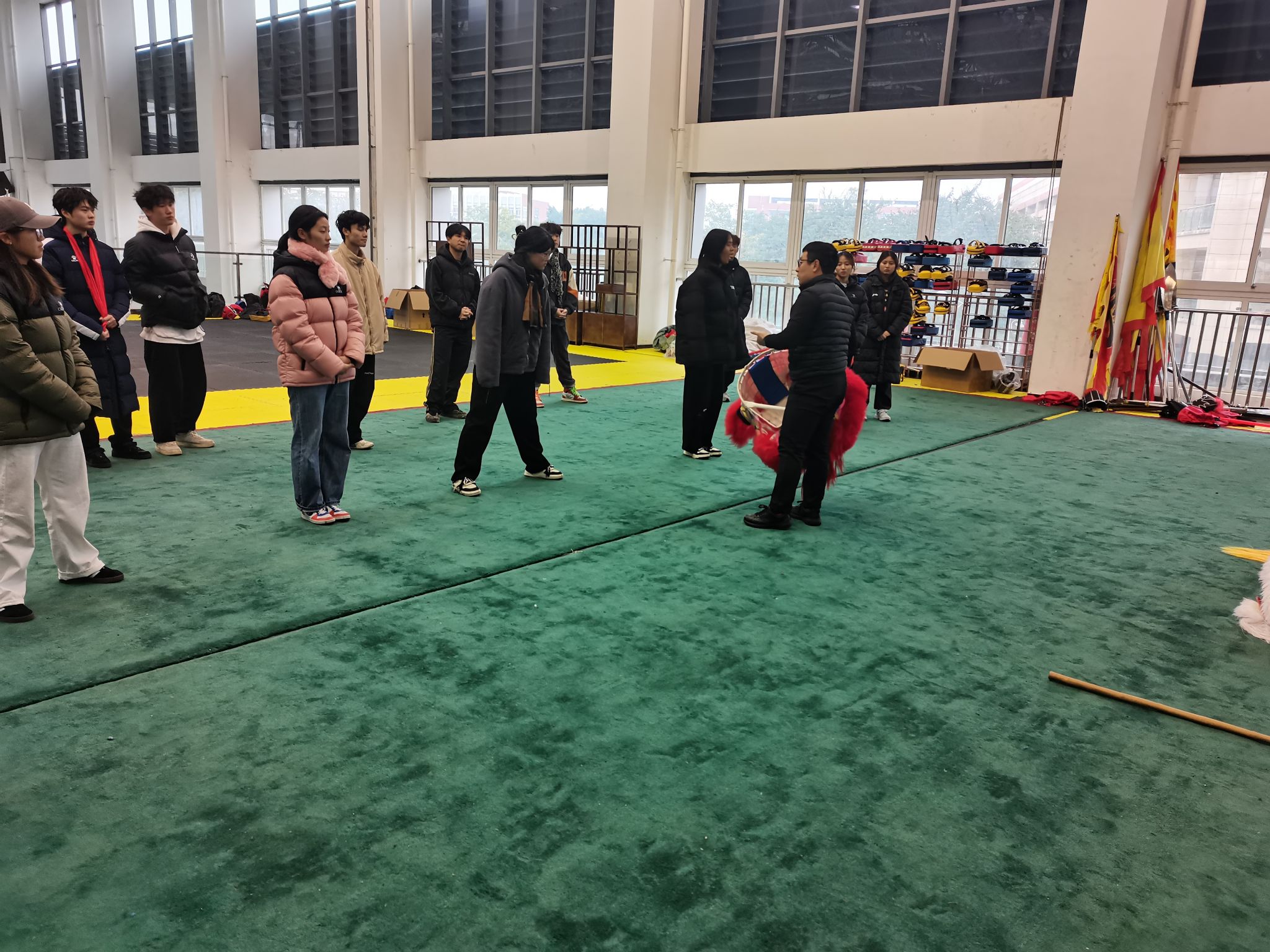 次日,即12月14日上午9:00至11:00,培训活动继续进行。同学们在冯剑老师的指导下,开始了单独节目的编排。这一环节不仅考验了同学们的舞狮技艺,更激发了他们的创造力和艺术表现力。同学们纷纷表示,通过此次培训,他们对舞狮这一非物质文化遗产有了更深入的了解和认识,也更加热爱和珍视中国的传统文化。