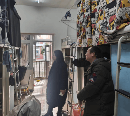 在巡视检查过程中,大部分寝室空气流通,地面桌面整洁,卫生情况良好。罗书记和辅导员们不仅关切地询问了同学们学习和生活情况;也对个别安全隐患问题耐心解释、明确要求;同时嘱咐同学们离校前要关闭电器设备、关闭门窗、倾倒垃圾,做好卫生清洁。在交谈中,罗书记还询问同学们离校的交通工具、假期安排,围绕诚信应考、人身财物、食品交通、人员交往、防诈防骗等方面,与同学们亲切交谈,气氛十分融洽。