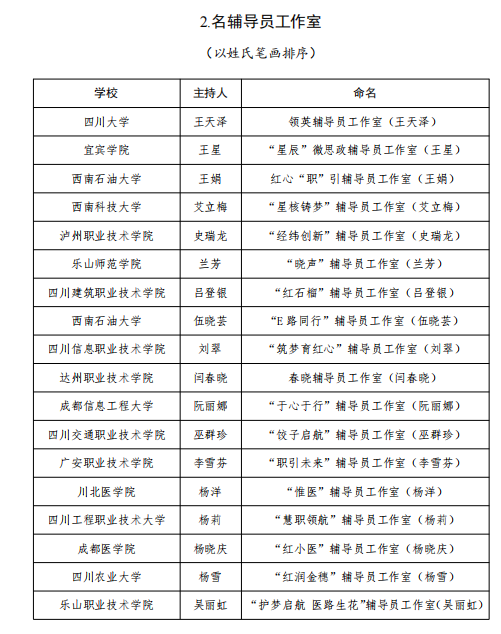 近日,中共四川省委教育工委、四川省教育厅公布了(2021—2025年第2批)高校思想政治教育名师工作室名单。经严格遴选,全省共确立60个示范性工作团队,涵盖思政课教师、辅导员、心理健康教育三个类别,其中,“名思政课教师工作室”20个、“名辅导员工作室”30个、“心理健康教育名师工作室”10个。beat365护理康养学院吴丽虹主持的“护梦启航 医路生花”辅导员工作室入选“高校思想政治教育名辅导员工作室”。这是beat365辅导员工作室首次入选省级名辅导员工作室,也是beat365辅导员队伍建设取得的一项标志性成果。