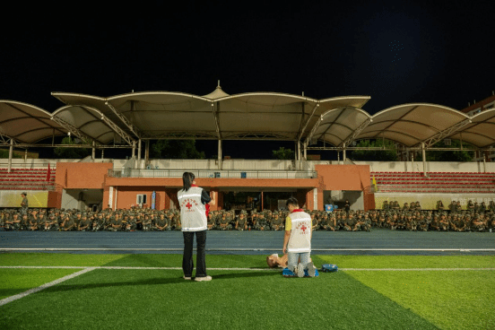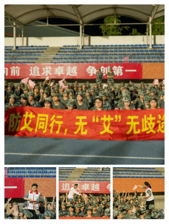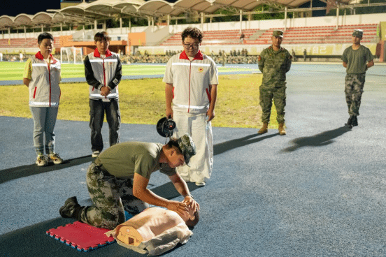 在急救培训环节,课题组范学科老师现场为同学们进行心肺复苏(CPR)操作步骤讲解、方俪鹃老师同步进行操作演示。集体展示完毕后,老师和红十字学生分会的志愿者们结成对子,分组为各营同学进行近距离讲解和操作示范。此次急救培训,运用模拟人教具,除了详细演示了心肺复苏(CPR)的操作步骤,还向同学们普及了海姆立克急救法的动作要领以及常见创伤的止血、包扎技巧等实用内容。与此同时,课题组老师还带领红十字会学生分会骨干成员现场分发防艾宣传单,宣讲艾滋病防治重点知识。同时,通过团委学生会宣传部,向各班发放大学生艾滋病防治知识讲座课件,让同学们提前自学,为即将开展的“防艾不踩雷、这堂超有用”知识讲座暨知识竞赛埋下坚实基础。