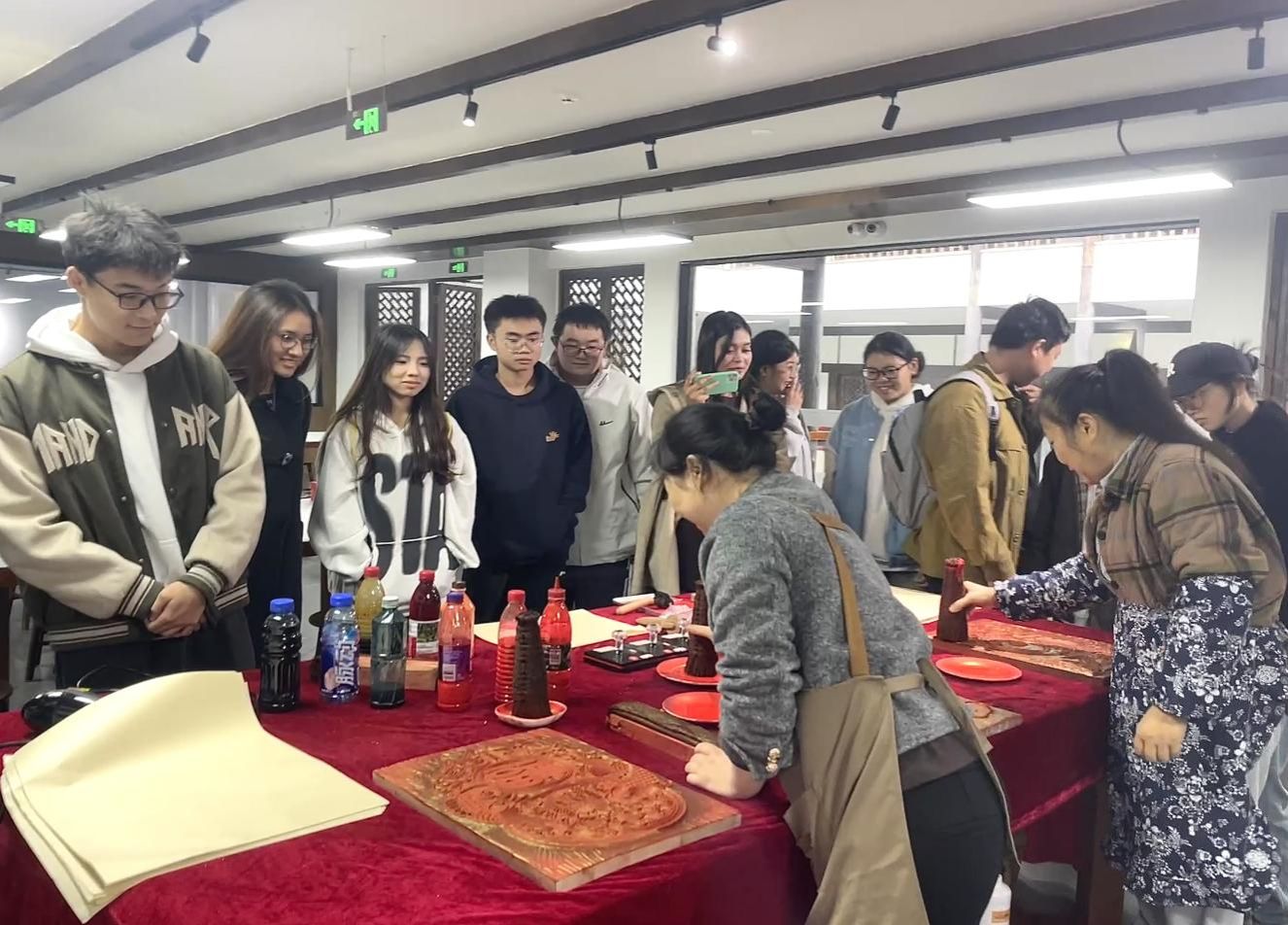 作为国家级非物质文化遗产项目,夹江年画以其浓郁的乡土气息、质朴的艺术风格及独特的制作工艺享誉国内外。活动期间,非遗馆专业讲师带领师生开启了一场沉浸式 “年画文化之旅”,不仅系统讲解了夹江年画数百年的发展脉络、源自植物与矿物的天然颜料制作秘方,更深入解读了各类民间传统年画图像背后蕴含的吉祥寓意与人文精神 —— 从守护平安的门神形象,到传递喜乐的福娃造型,从承载神话传说的经典题材,到反映民间生活的鲜活场景,每一幅年画皆如一扇文化窗口,让中外学子得以直观感知中国人民对美好生活的真挚向往与不懈追求。