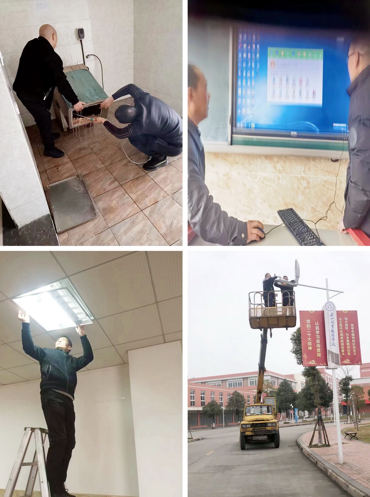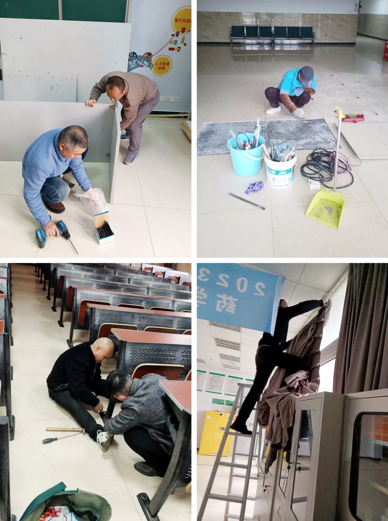 组织维修工维修教室、宿舍桌椅设备,检修了教学电子白板、照明灯、门锁设备,配备了教学卫生用具(粉笔、卫生工具等),清洗了开水器以及部分楼宇的窗帘、空调滤网等,以保障开学后设备能正常使用。