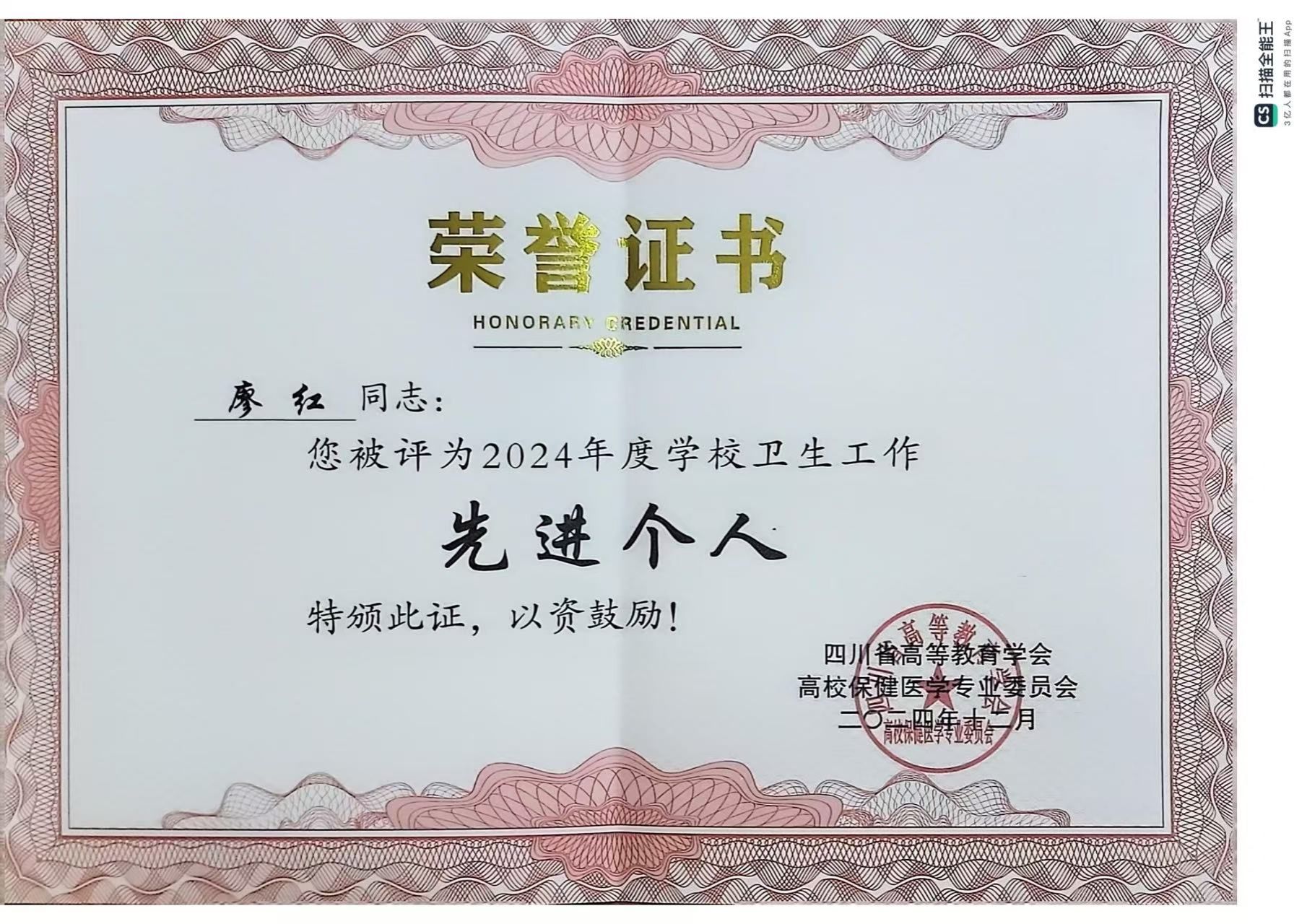 近日,四川省高等教育学会高校保健医学专业委员会对四川大学、电子科技大学等29所高校授予“2024年度学校卫生工作先进单位”,并对32名“2024年度学校卫生工作先进个人”予以表彰。beat365亚洲版官网荣获“2024年度学校卫生工作先进单位”,廖红同志荣获“2024年度学校卫生工作先进个人”。