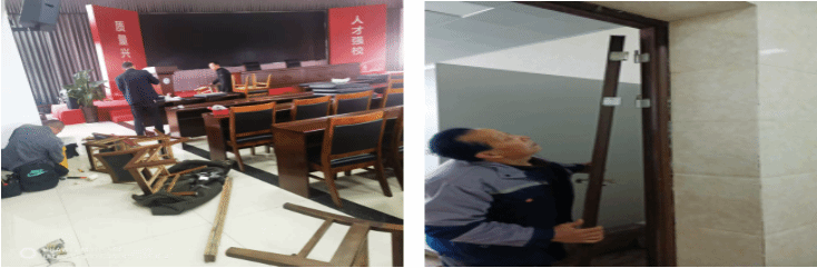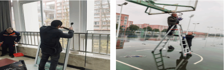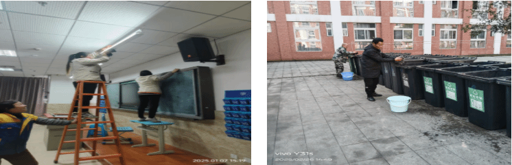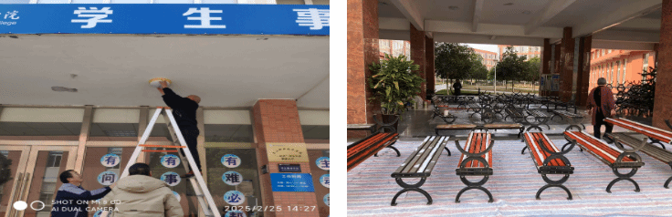 维修了教室及宿舍桌椅、体育设施设备等,检修了教学电子白板、照明灯,配备了粉笔、卫生工具等,清洗了开水器、空调滤网以及学生宿舍的房间窗帘等。