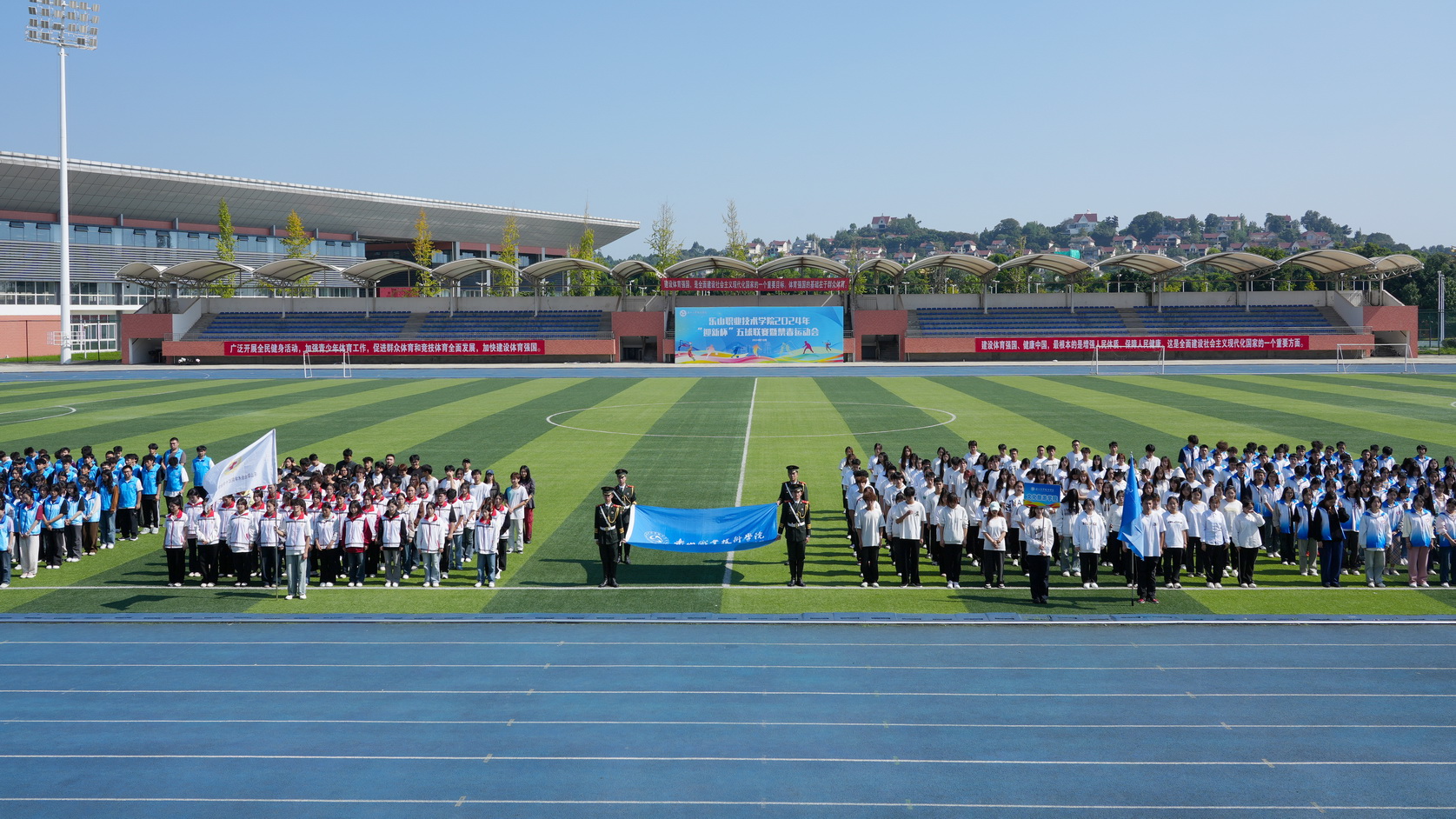 各二级学院的运动员代表队在音乐的伴随下以整齐的步伐、昂扬的姿态步入会场,脸上洋溢着自信与激情,充分展现了乐职学子的风采与活力。他们挥舞着旗帜,高喊着口号,展示自己的团队精神和对胜利的渴望,成为开幕式上一道亮丽的风景线。
