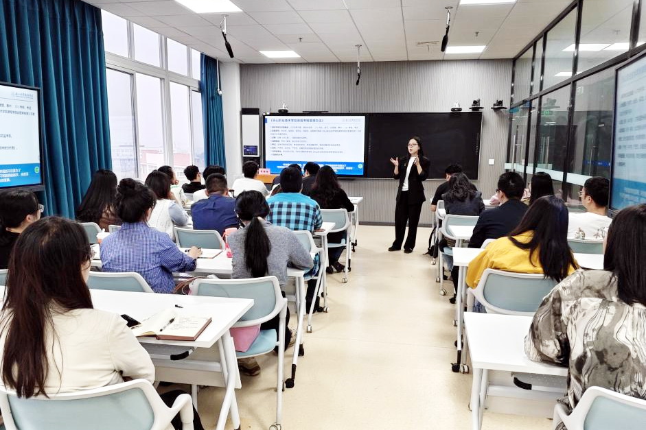 彭瑶瑶从“教师教学行为规范”“调课、停课规范”“课程考试(考核)规范”“教学资料规范”“学生学籍管理”“教学质量提升”六个方面进行了介绍,让新教师们快速、清晰地了解掌握教学管理相关要求。她鼓励教师们积极开展教学研究,不断探索新的教学方法和手段,以适应不断变化的教育需求。
