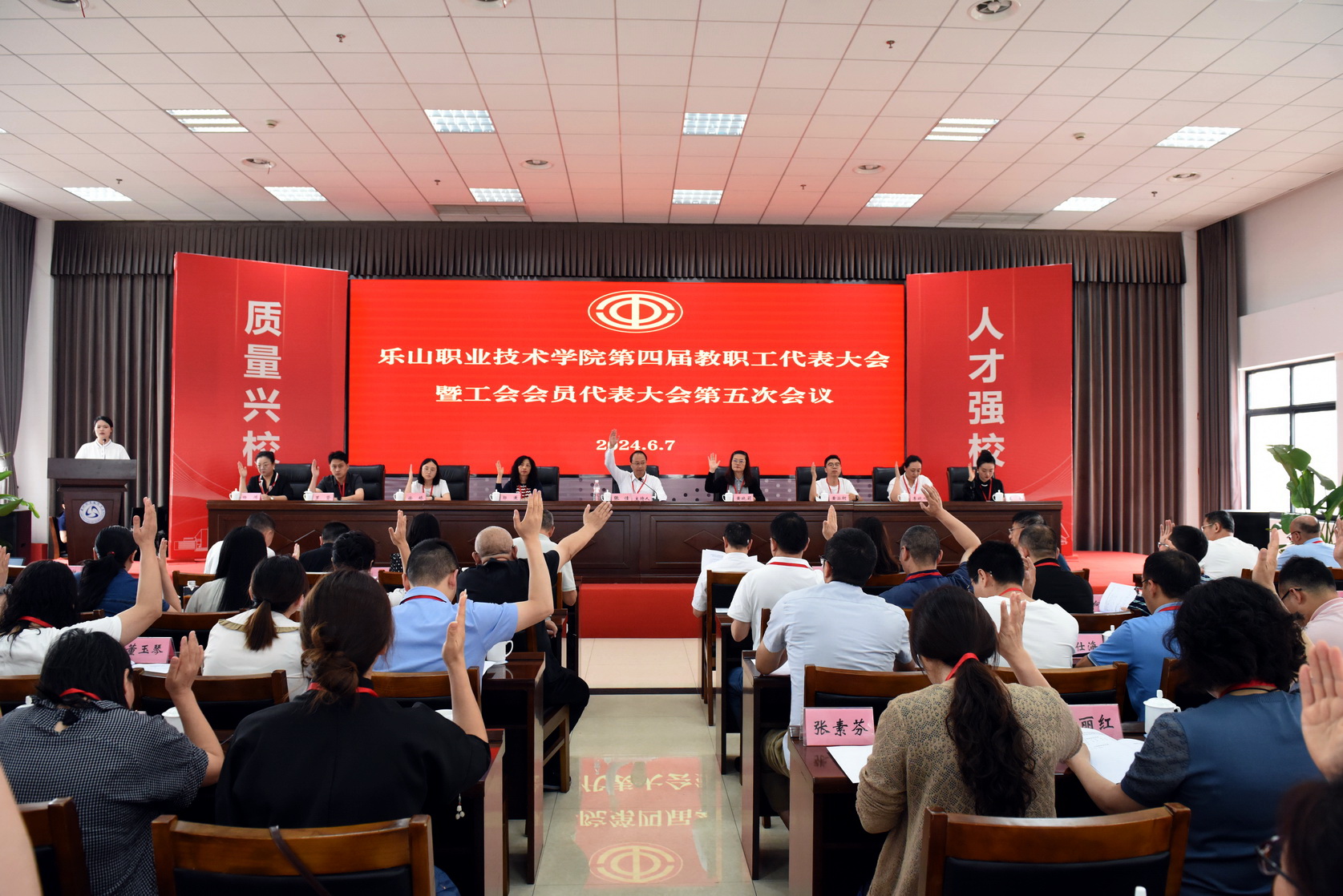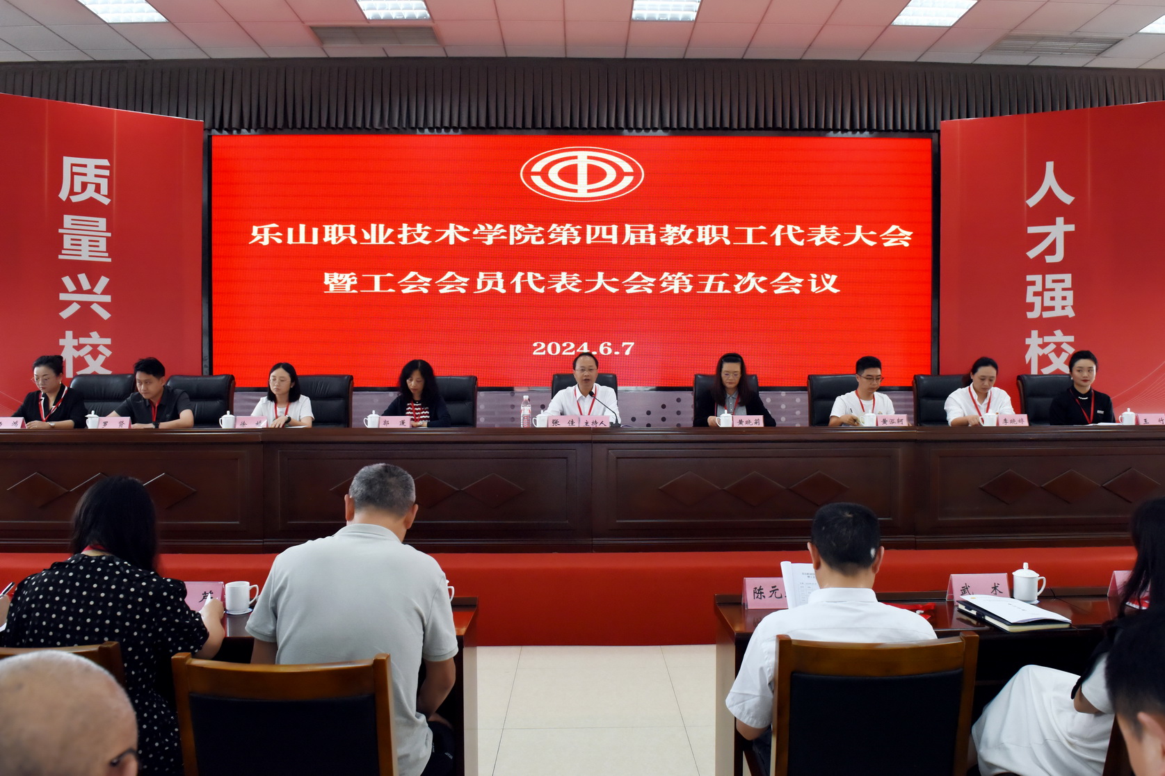 6月7日下午,beat365亚洲版官网第四届教职工代表大会暨工会会员代表大会第五次会议在学术交流中心3004会议室召开。学校党委副书记张佳主持会议。校纪委书记李昌贵,党委委员、副校长陈元进、周芹作为特邀代表列席会议,部分非代表的中层干部列席会议,教代会正式代表90名,因公、因病请假14名,76名教代会代表参加了会议。