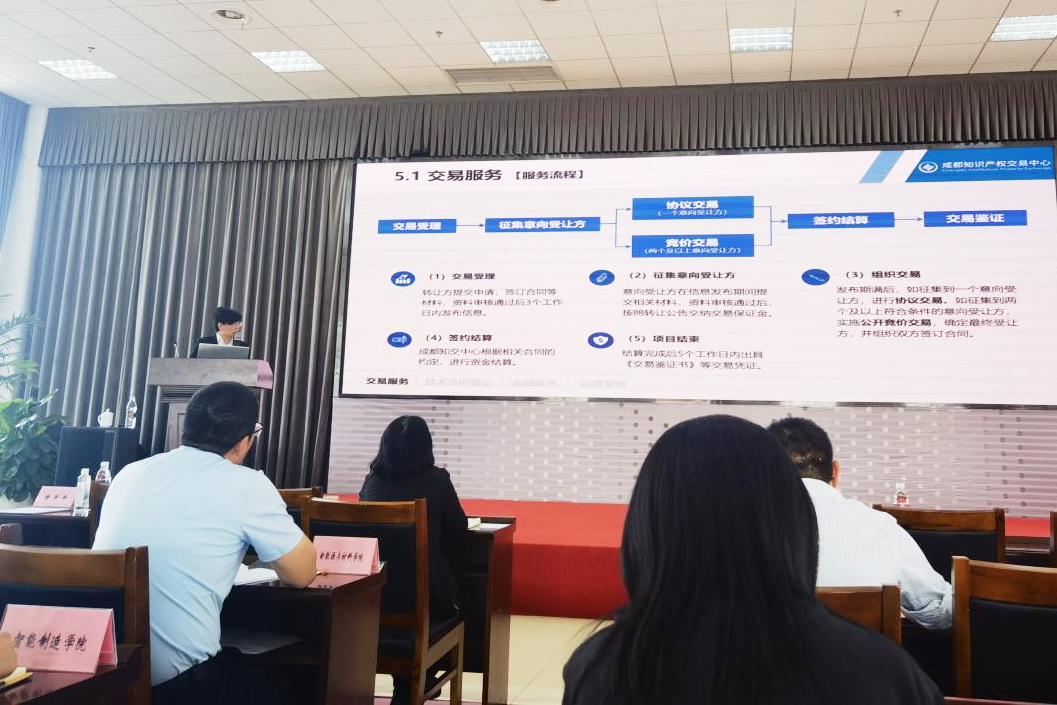 随后,成都知识产权交易中心交易服务部主管詹平平作了《知识产权交易转化运用及存量专利盘活实务培训》专题讲座,从国家政策、供需对接、专利开放许可、存量专利盘点等多个方面,详细介绍了知识产权交易转化运用及存量专利盘活的操作步骤和注意事项。专题培训进一步加深了参会师生对知识产权转化运用的理解和认识。