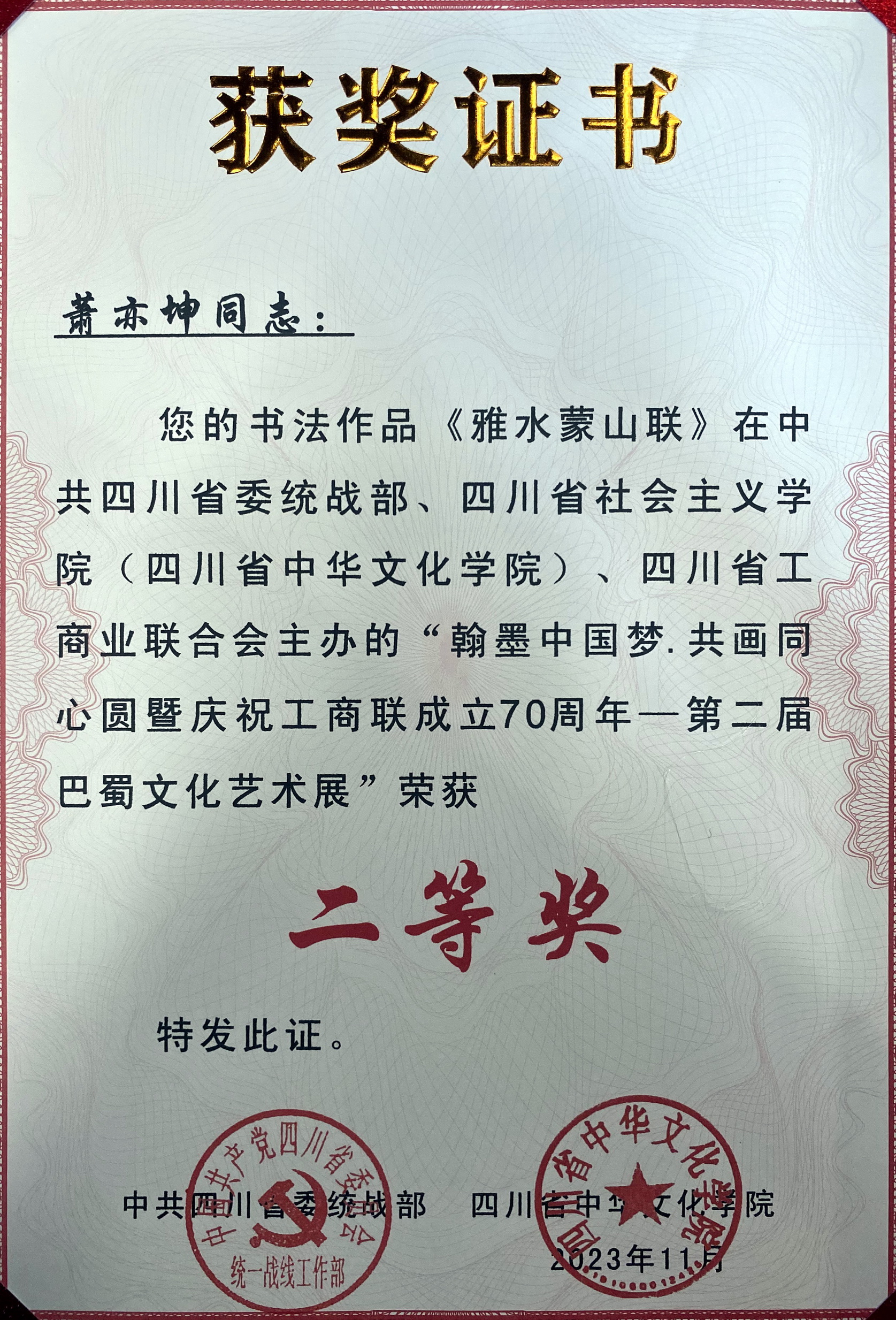 “翰墨中国梦•共画同心圆”暨庆祝工商联成立70周年——第二届巴蜀文化艺术展2023年12月在四川省社会主义学院举行。去年9月以来,组委会向省内艺术家、摄影家、艺术爱好者以及川籍其他省市和港澳台、海外的艺术家征集展示“巴蜀文化”的书法、美术、摄影、非遗等作品。各界人士踊跃投稿,组委会邀请业内专家对投稿作品开展了评审,共评选出书法、国画、油画、摄影、非遗、版画获奖作品90余件,其中书法二等奖10件。