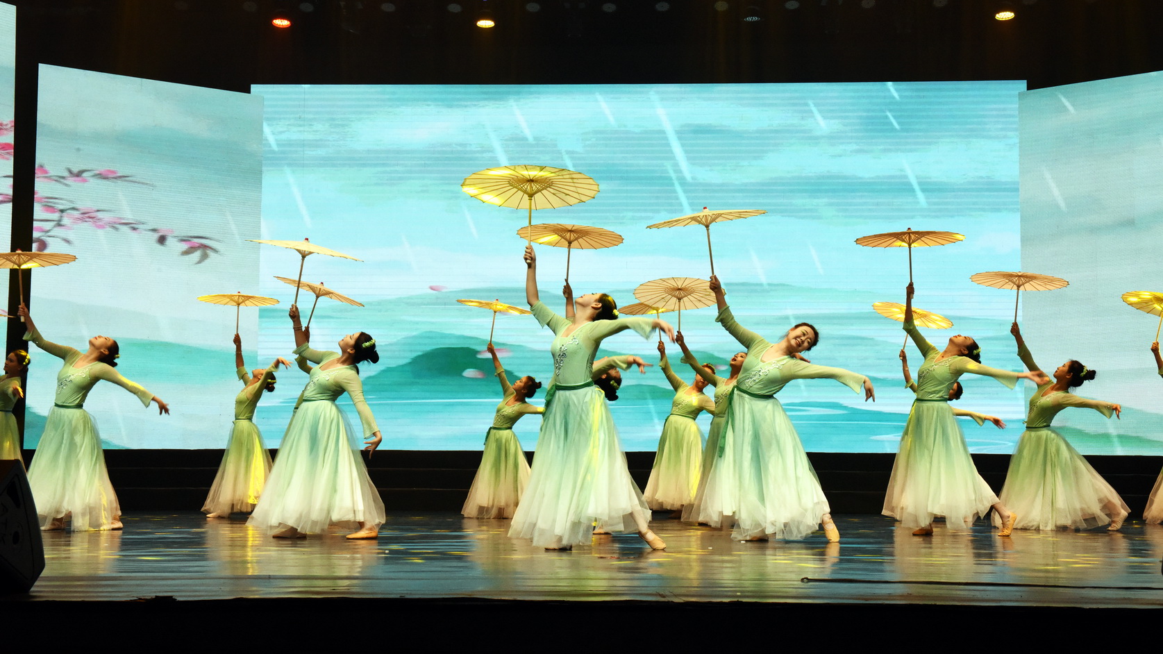 舞蹈《雨涧春行图》以江南山水为题,以诗入舞,在浸透自然与清新的烟雨下,碧衣携青伞,身临其境,步入微雨的春景。