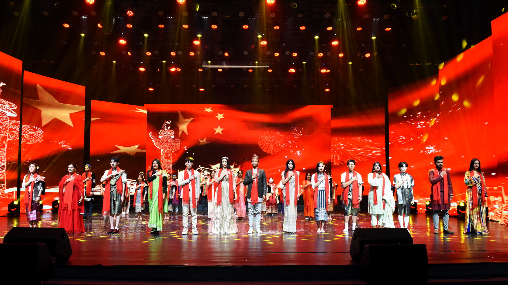 国际学生们也为大家带来了《携手共寰宇》,节目集走秀、舞蹈、合唱于一体,灵动的身影,起步扬手,回眸旋踵,直抵人心。在轻盈的衣袖,与悠长的音乐之间,尽展异域风情,一曲《我的中国心》博得全场的热烈欢呼。