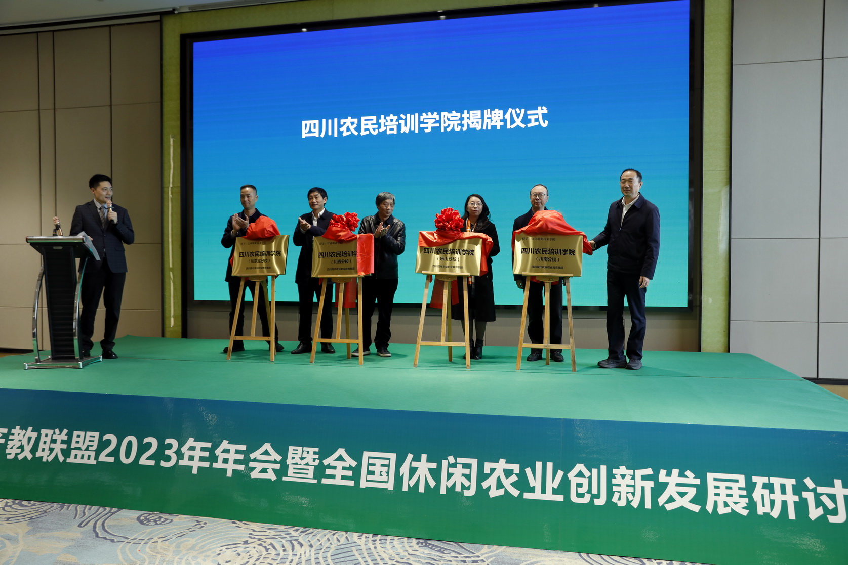 2023年12月6日,四川农民培训学院揭牌仪式在中国休闲农业产教联盟2023年会上举行。全国农村产业融合发展联盟、省农业农村厅相关领导出席会议,全国涉农相关院校、企业代表200余人参加了会议。学校党委委员、副校长周芹应邀为四川农民培训学院揭牌。