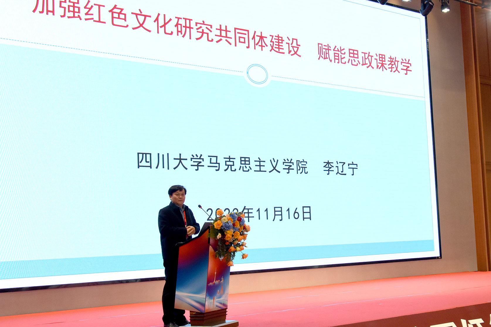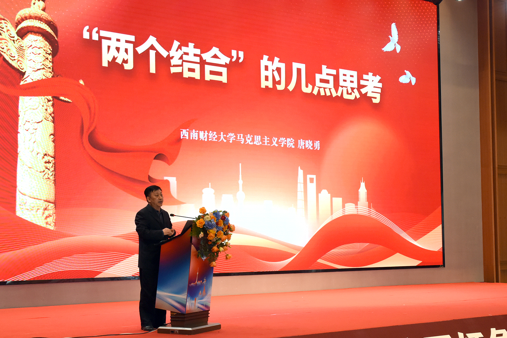 会前,与会人员观看了beat365亚洲版官网师生理论宣讲作品《百年风华 青春不老》。共同体成立仪式结束后,首届川渝红色文化教育论坛主旨报告举行。西南财经大学马克思主义学院院长唐晓勇教授、浙江理工大学红色文化研究院院长渠长根教授、四川大学马克思主义学院博士生导师李辽宁教授分别围绕习近平总书记来川视察重要指示精神、“大思政课”建设、红色文化赋能思政课建设三个主题开展了主旨报告。
