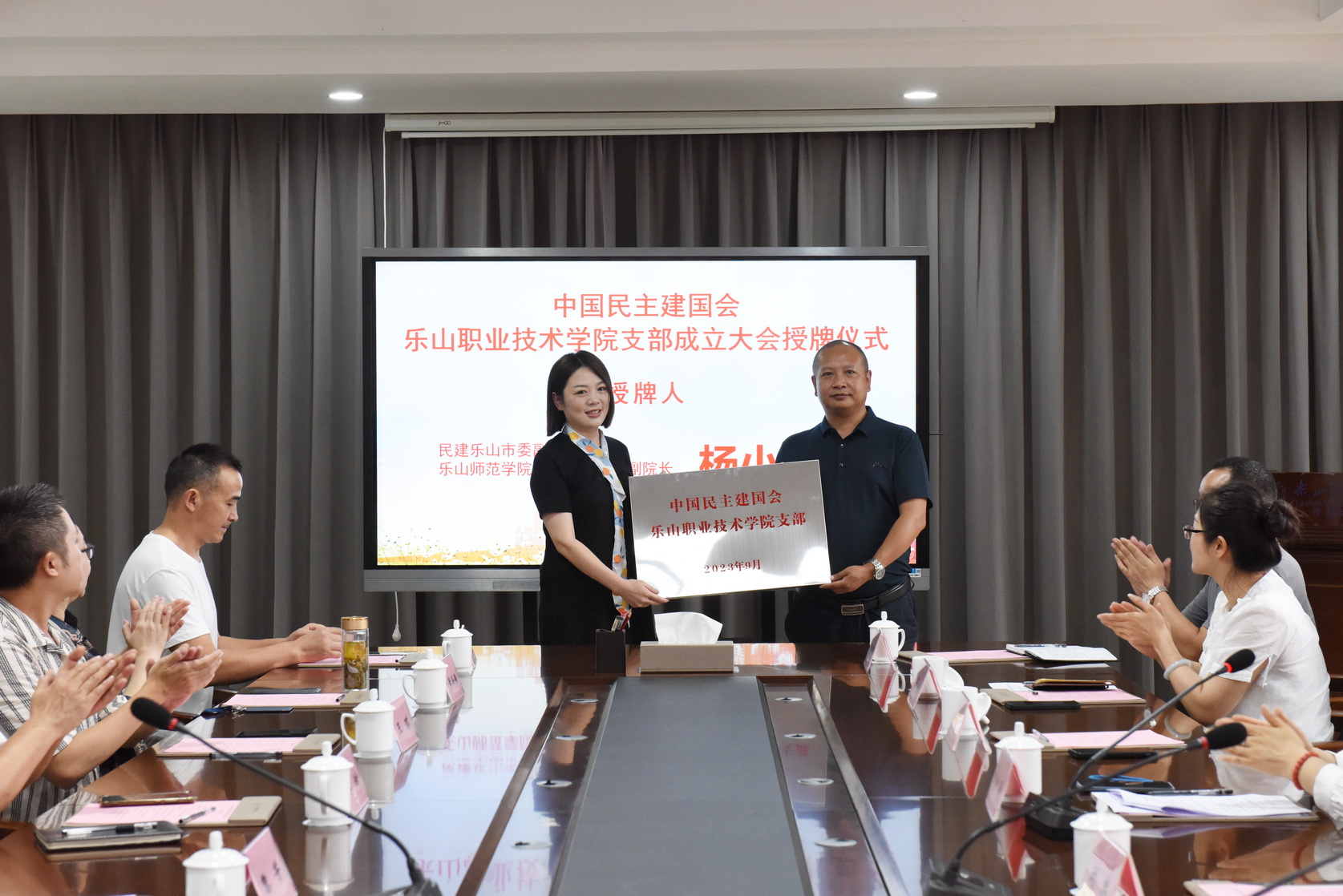 2023年9月19日上午,民建beat365亚洲版官网支部(以下简称民建乐职院支部)成立大会在beat365亚洲版官网学术交流中心召开。九三学社乐山市委副主委、beat365亚洲版官网校长刘忠,中共乐山市委统战部副部长易海波,beat365亚洲版官网党委副书记陈芝海,民建乐山市委副主委、市人大常委会教科文卫工委主任金漫,民建乐山市委副主委、乐山师范学院经济管理学院副院长杨小川参加会议,会议由金漫主持。会议宣读了《民建乐山市委关于成立民建beat365亚洲版官网支部的决定》,通报了民建乐职院支部第一届委员会选举结果。杨小川代表民建乐山市委为民建乐职院支部授牌。黎芳当选民建乐职院支部主委并作表态发言,詹恒当选支部副主委,陈雄当选支部委员。