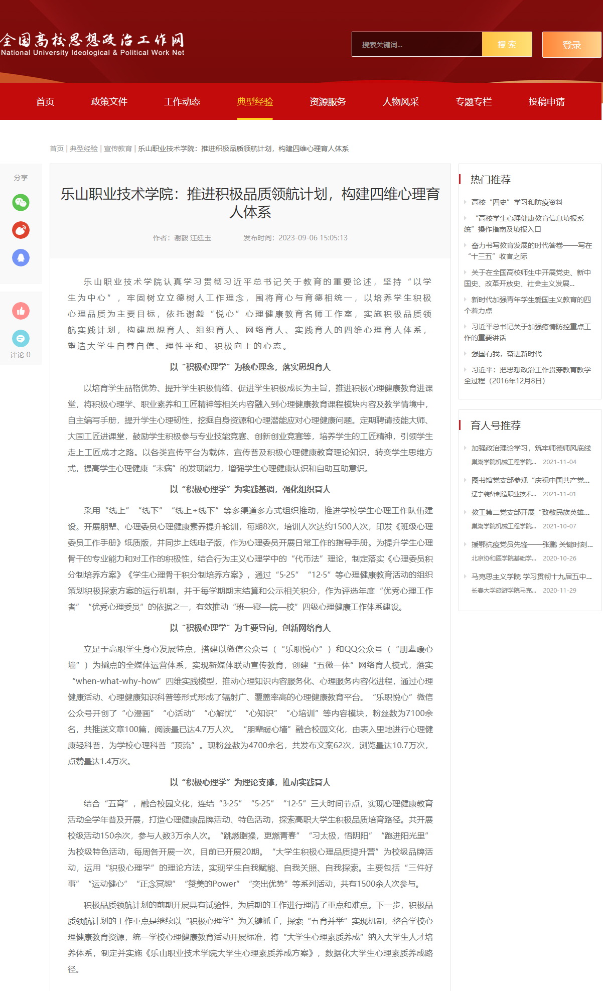 2023年9月6日,beat365心理育人工作案例《推进积极品质领航计划,构建四维心理育人体系》被全国高校思想政治工作网采用。全国高校思想政治工作网是高等教育出版社主办,教育部主管,教育部思政司指导的全国高校思政工作的资源集散库、思想文化策源地和宣传舆论风向标平台。